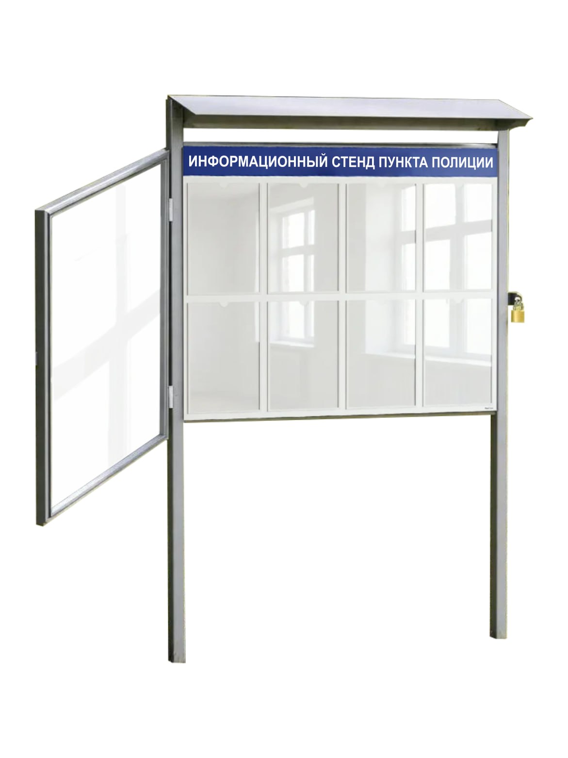 Уличный информационный стенд предназначен для размещения официальной информации в пунктах полиции, участковых опорных пунктах и на прилегающих территориях. Подходит для информирования граждан о графике работы, контактах, нормативных документах и объявлениях.